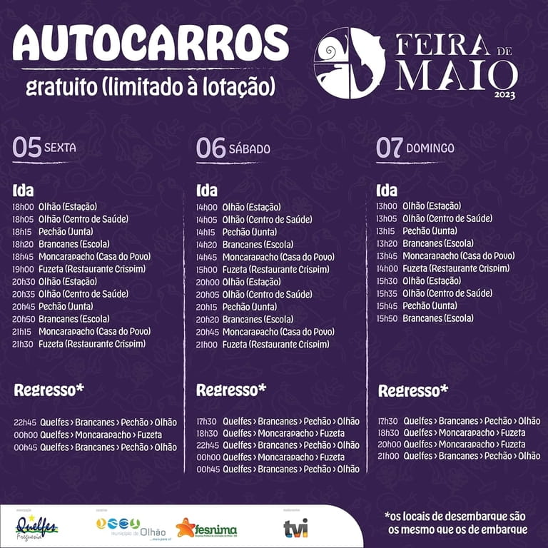 O Município de Olhão disponibiliza transporte gratuito para a Feira de Maio, em vários horários, com paragens em Olhão, Pechão, Brancanes, Moncarapacho e Fuseta. A entrada é livre e o evento é perfeito para amigos e famílias que procuram diversão, carrosséis e comida.